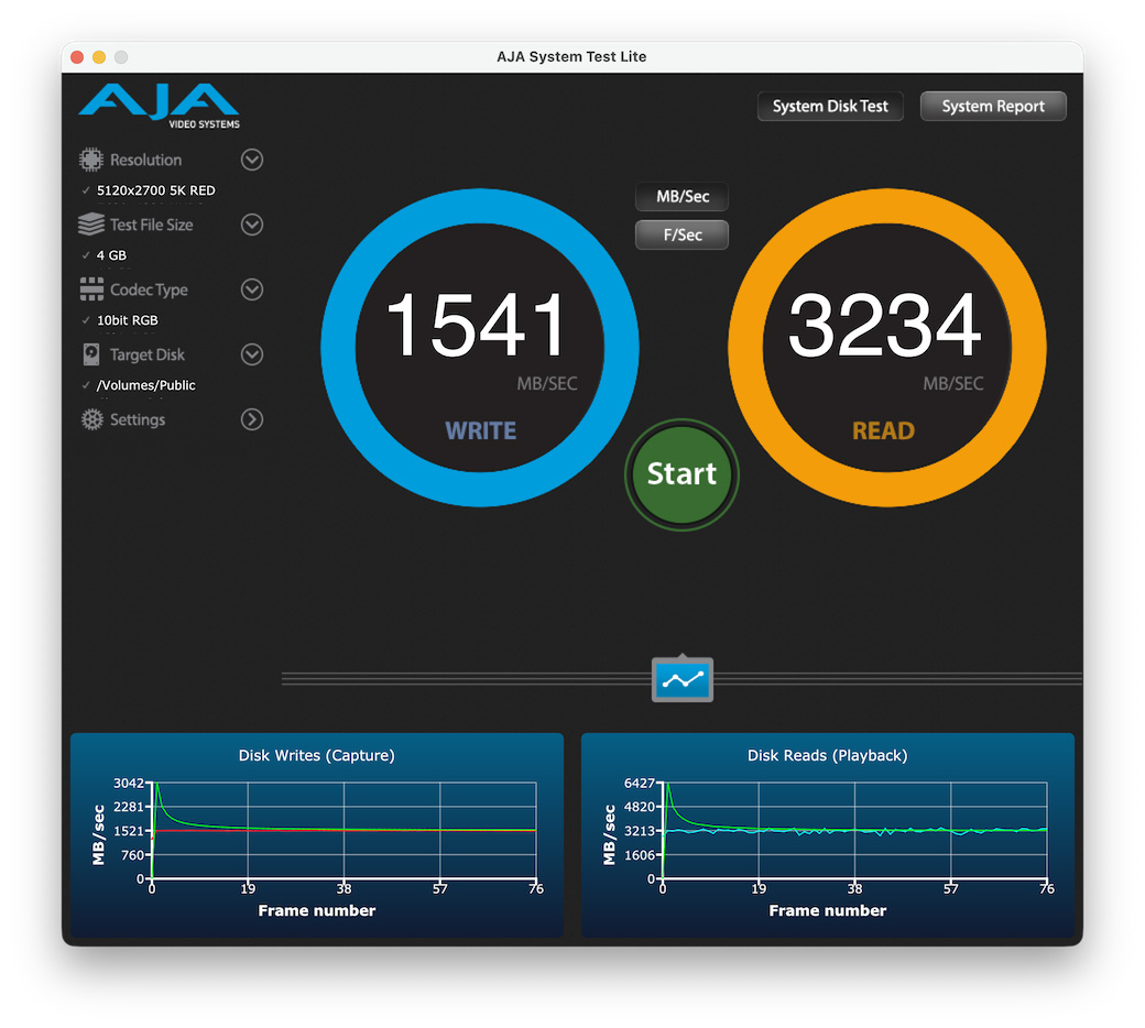 Pro syntetické testování jsem použil aplikaci AJA System Test Lite, která v tomto případě naměřila hodnoty zápisu přes 1,5 GB/s a čtení 3,2 GB/s.