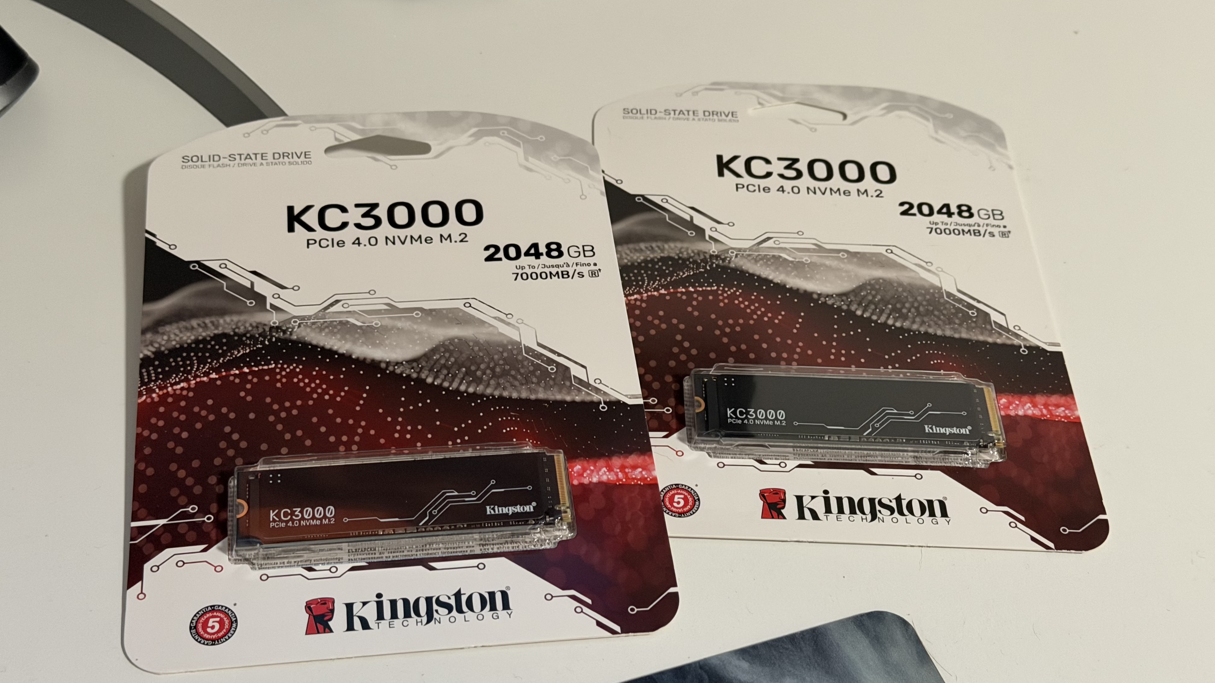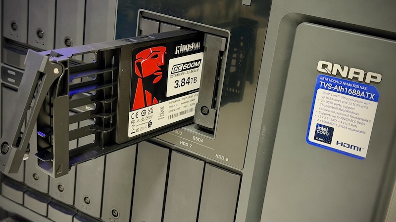Pro systémovou část a test provozu virtuálních strojů jsem zvolil dvojici M.2 NVMe SSD Kingston KC3000 o kapacitě 2TB (PN: SKC3000D/2048G). Protože TVS-AIh1688ATX nemá interní M.2 sloty, použil jsem QNAP adaptéry QDA-UMP4, které umožňují osazení M.2 NVMe modulů do standardních 2,5″ a zachovávají rychlost NVMe.
