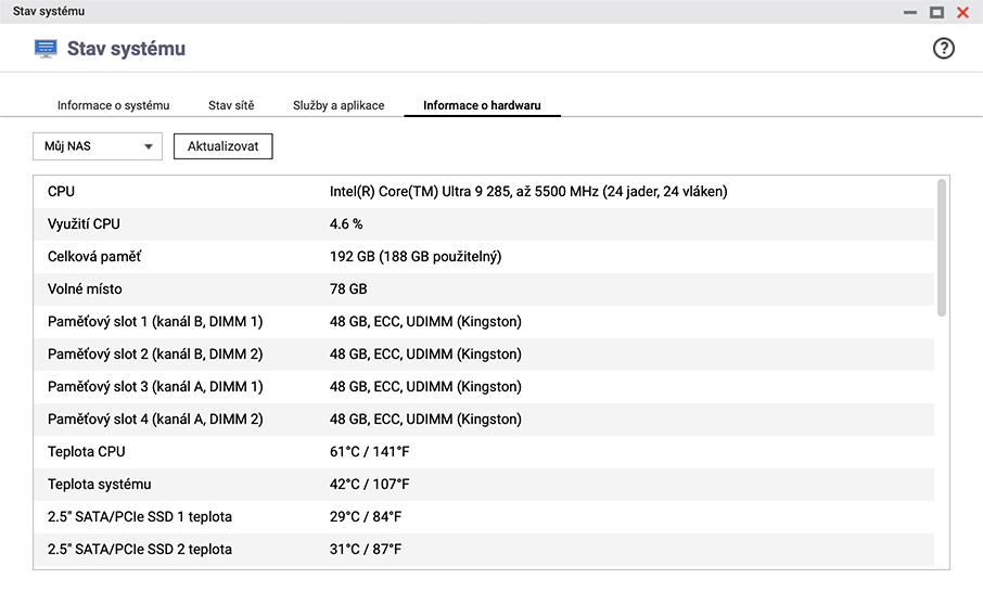 Ještě zhruba do poloviny října 2025 se cena jednoho modulu pohybovala okolo 6 000 Kč, nicméně v důsledku současného AI boomu a zvýšené poptávky po ECC pamětech je dnes cena zhruba pětinásobná. Nezbývá než doufat, že se trh časem vrátí do rozumnějších kolejí. Každopádně právě velká kapacita RAM je jedním z klíčových benefitů tohoto NASu - ať už pro virtualizaci, práci se ZFS cache technologiemi, nebo náročnější aplikační scénáře.