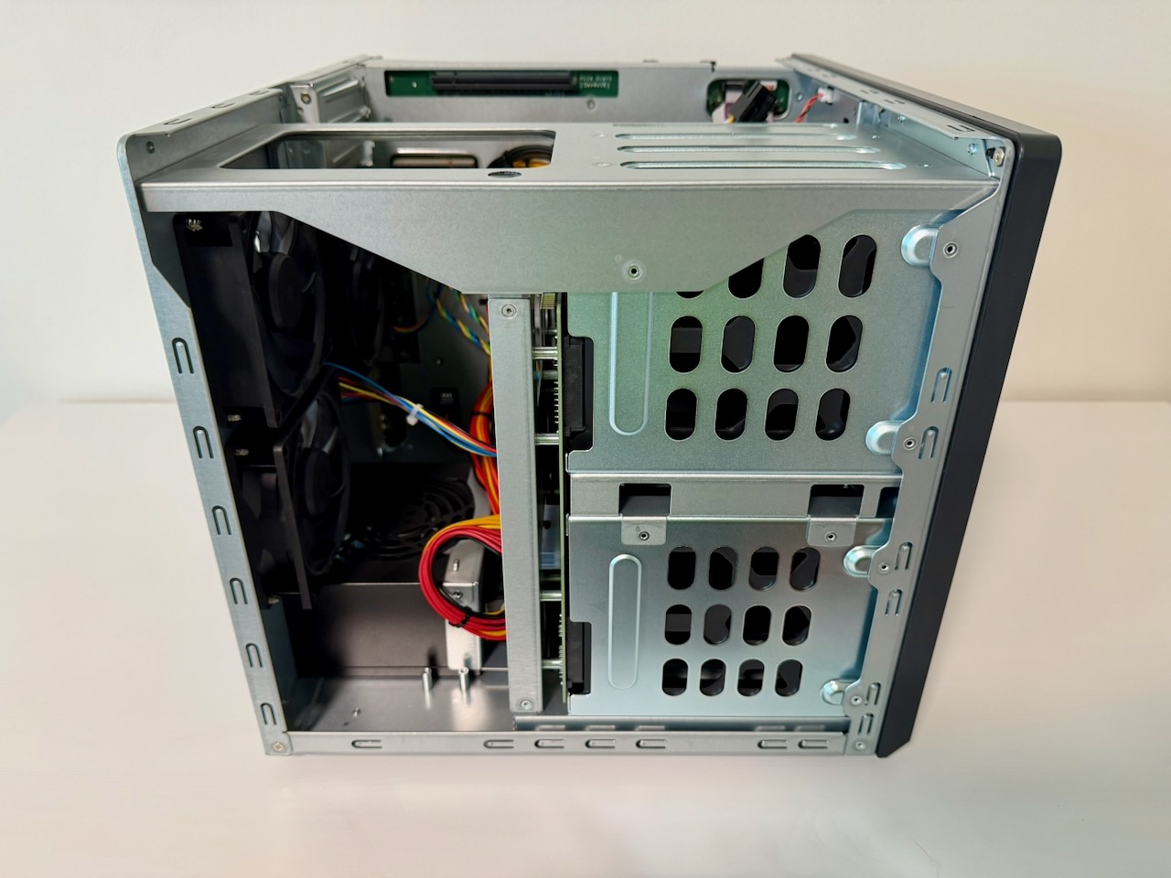 Na první pohled je jasné, že QNAP TVS-AIh1688ATX není klasický desktopový NAS. Robustní ATX šasi, masivní chlazení, velkorysý vnitřní prostor a důraz na rozšiřitelnost dávají jasně najevo, že se tady počítá s vysokým výkonem, dlouhodobým zatížením a profesionálním nasazením. Design je účelový, technický a nepodřizuje se efektu – vše je navrženo s ohledem na airflow, servisovatelnost a možnost dalšího rozšíření.