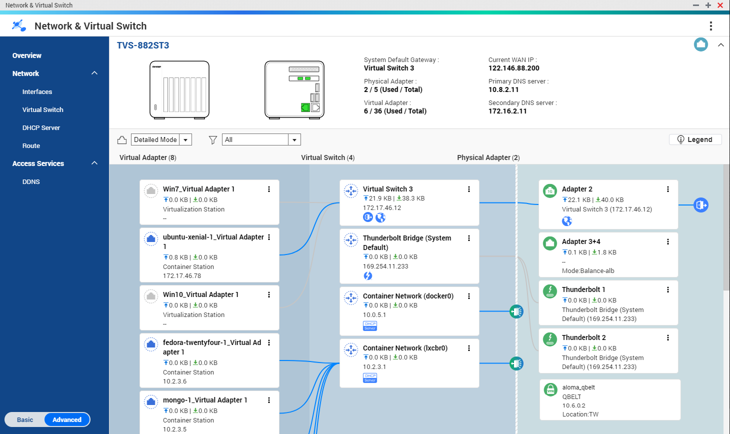Screenshoty z QTS 4.3.5, konkrétně NVS (Síťový a virtuální přepínač) a nové QVPN2: