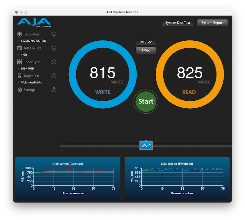 AJA benchmark (5K, 4GB soubor): 815 MB/s zápis a 825 MB/s čtení